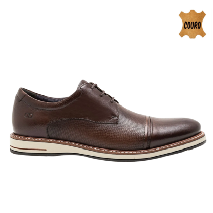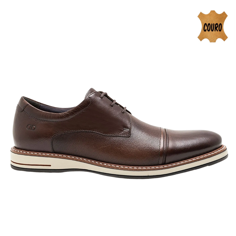 O modelo é confeccionado em couro, material conhecido pela durabilidade e adaptação ao uso frequente. A palmilha macia contribui para absorção de impactos durante a caminhada, auxiliando no conforto ao longo do dia.