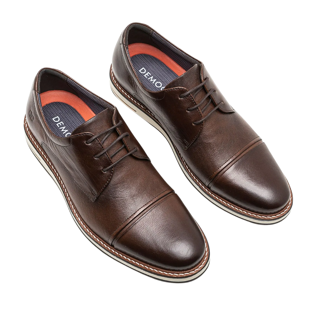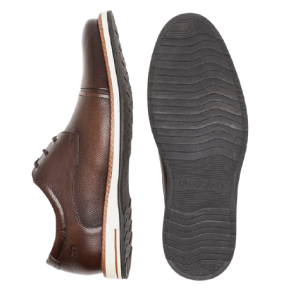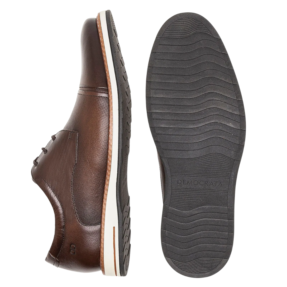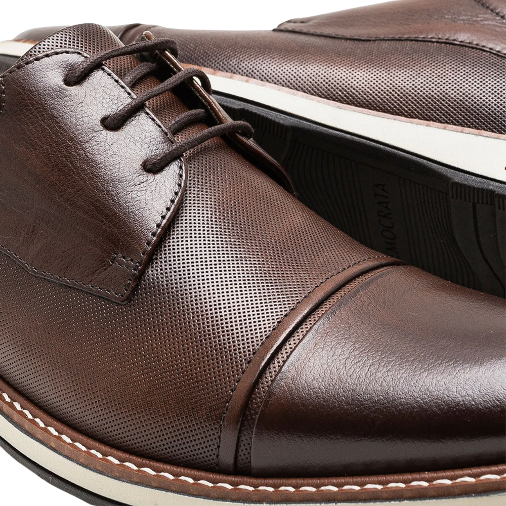 O Sapato Democrata em Couro com Cadarço Masculino é indicado para compor produções formais e sociais, sendo uma opção para trabalho, reuniões e eventos que pedem um visual mais clássico. Seu design sóbrio combina com diferentes estilos de roupas formais.